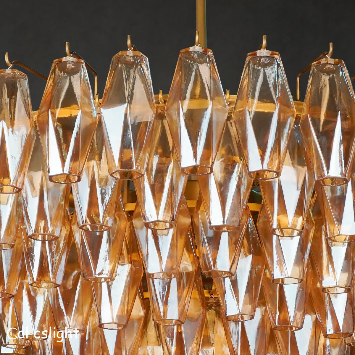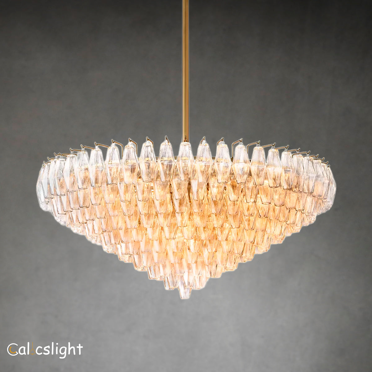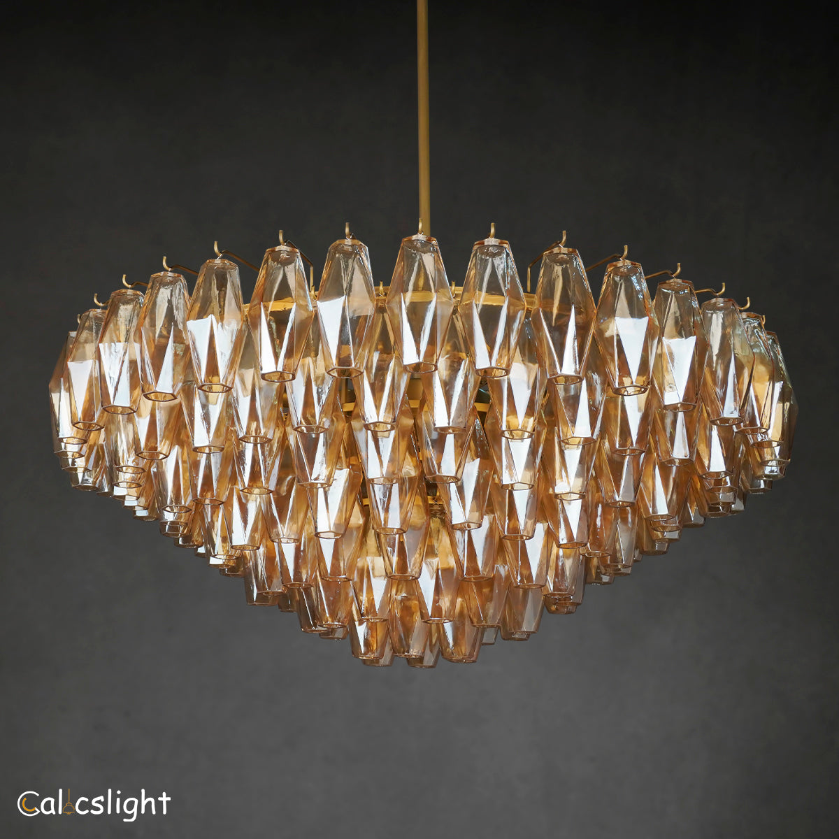 The Chavelle Series captures the elegance of mid-century Italian design with a striking composition of handblown glass polyhedrons. Each faceted shade is meticulously crafted and suspended from a minimalist steel frame, forming a dramatic, layered silhouette. When illuminated, the glass elements scatter light in all directions, producing a warm, shimmering ambiance. This sculptural chandelier serves as both a functional light source and a captivating focal point, ideal for entryways, dining rooms, or spaces that call for timeless sophistication.