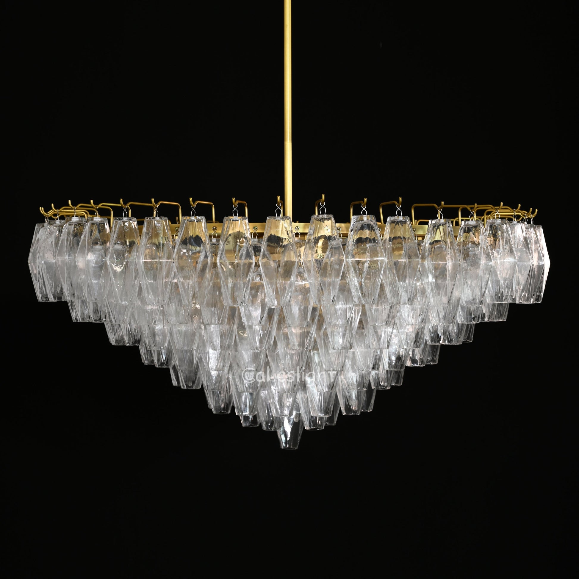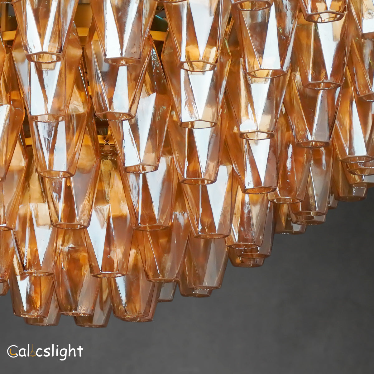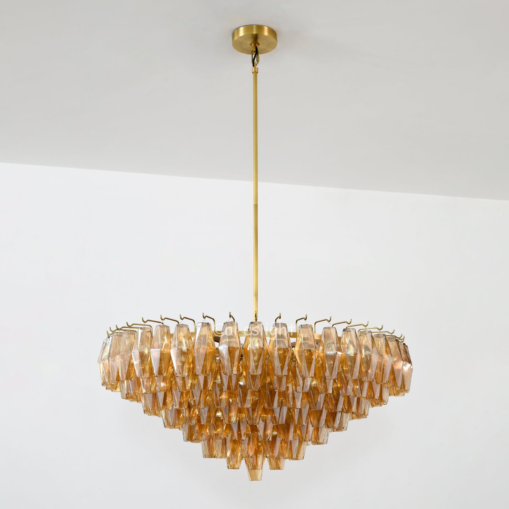 The Chavelle Series captures the elegance of mid-century Italian design with a striking composition of handblown glass polyhedrons. Each faceted shade is meticulously crafted and suspended from a minimalist steel frame, forming a dramatic, layered silhouette. When illuminated, the glass elements scatter light in all directions, producing a warm, shimmering ambiance. This sculptural chandelier serves as both a functional light source and a captivating focal point, ideal for entryways, dining rooms, or spaces that call for timeless sophistication.