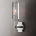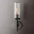 The Lambrey Short Bathroom Glass Wall Sconce features intricately incised glass panels with a diamond pattern, adding subtle texture and elegance. Framed in Lacquered Burnished Brass, Matte Black, or Polished Nickel, its polished metal plate enhances the refined aesthetic. Perfect for vanity lighting, this sconce blends industrial detail with modern sophistication.