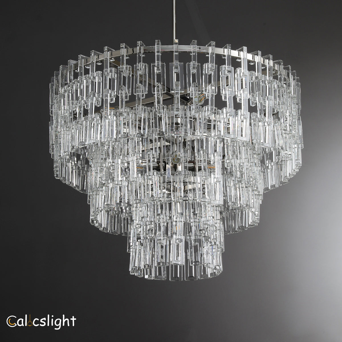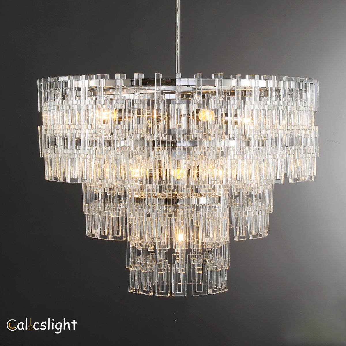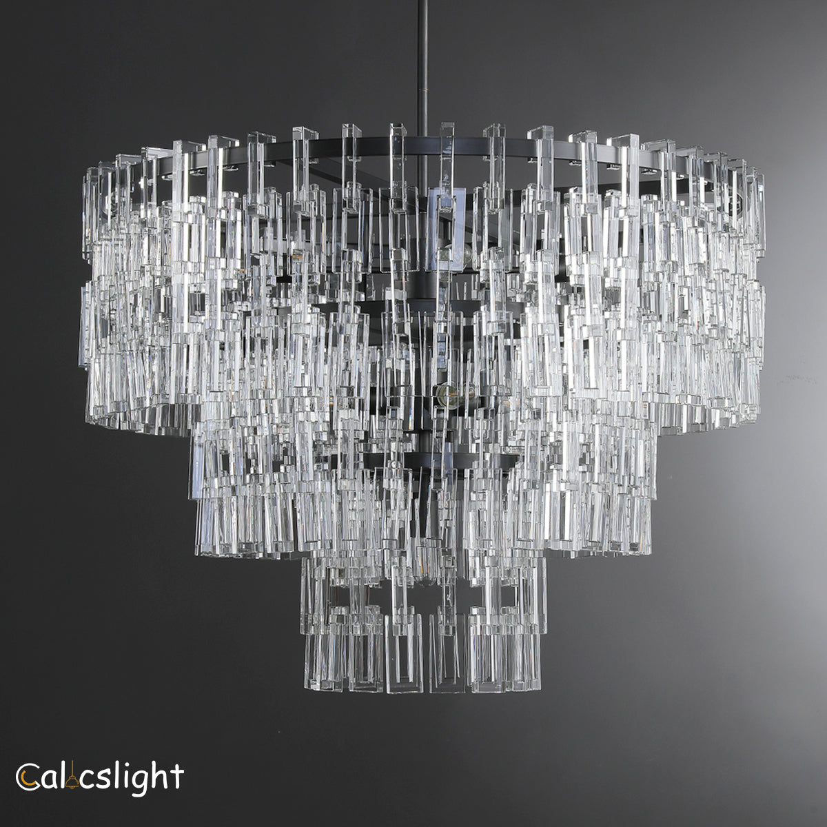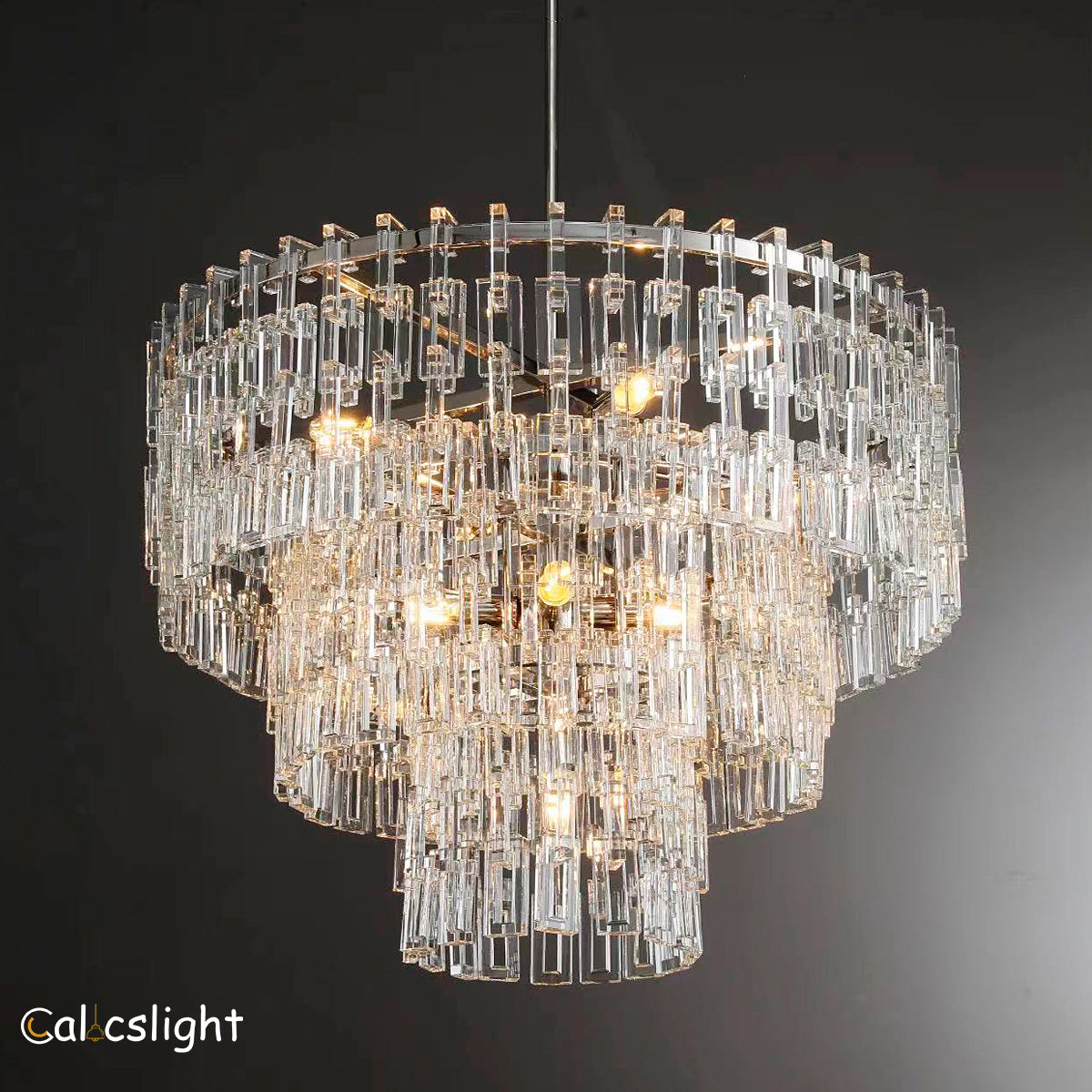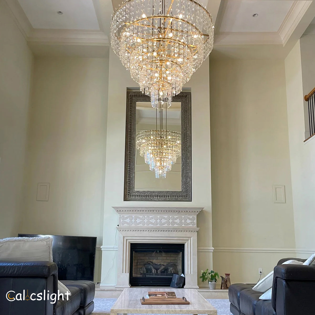 This chandelier showcases a dramatic tiered silhouette formed by over 350 precisely arranged K9 crystal pieces. Each interlocking glass element captures and refracts light, creating a radiant cascade that sparkles from every angle. Suspended with minimal hardware for a floating effect, the round form adds sculptural elegance to dining rooms, foyers, or grand living spaces.