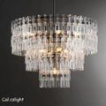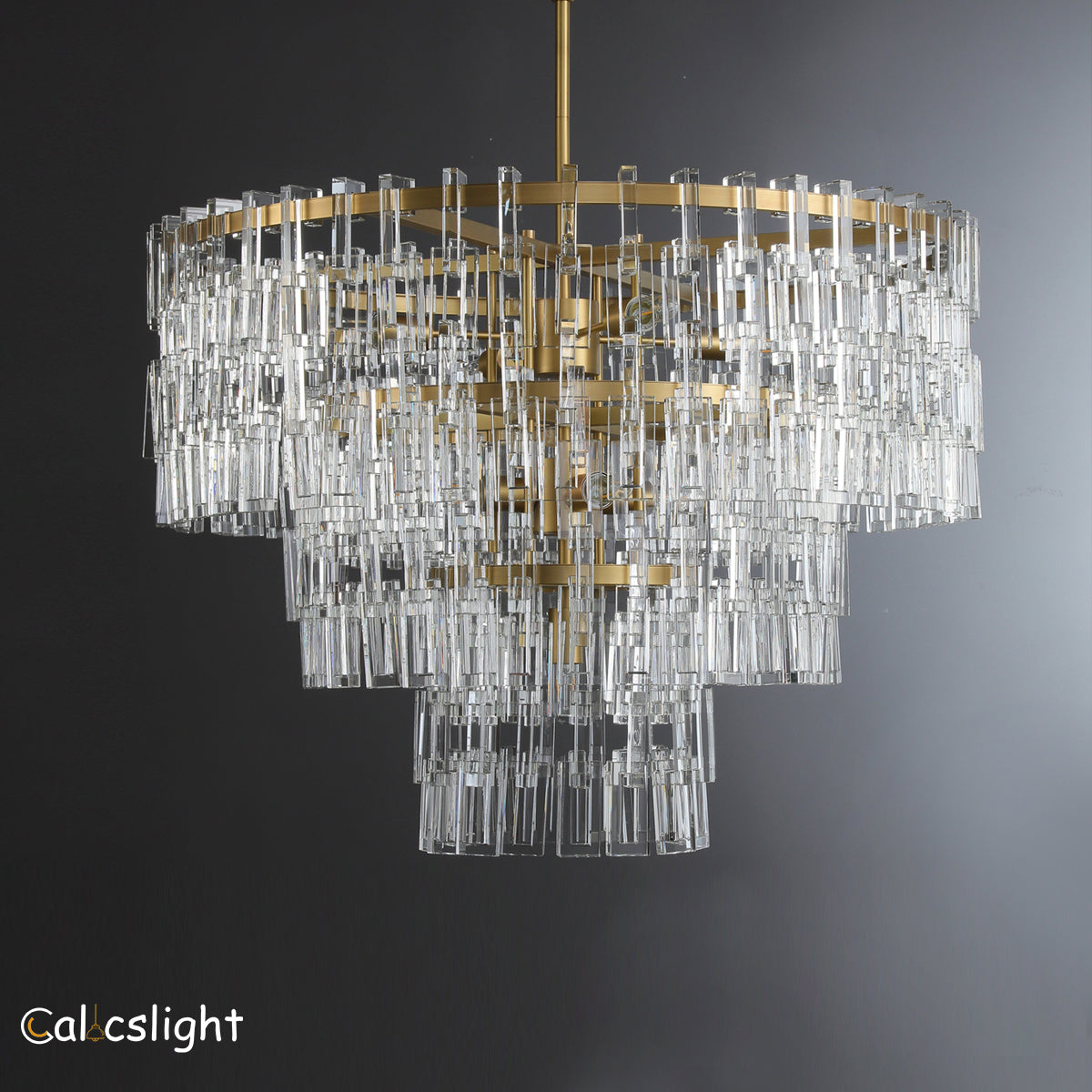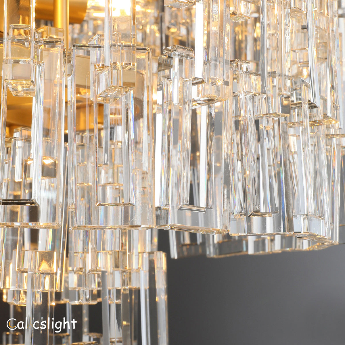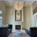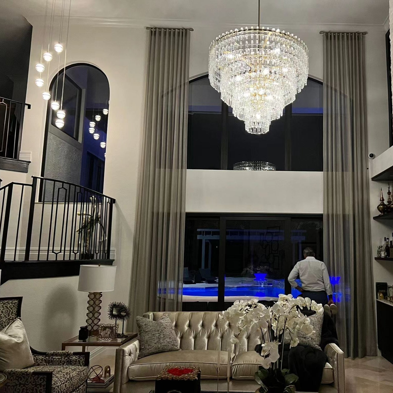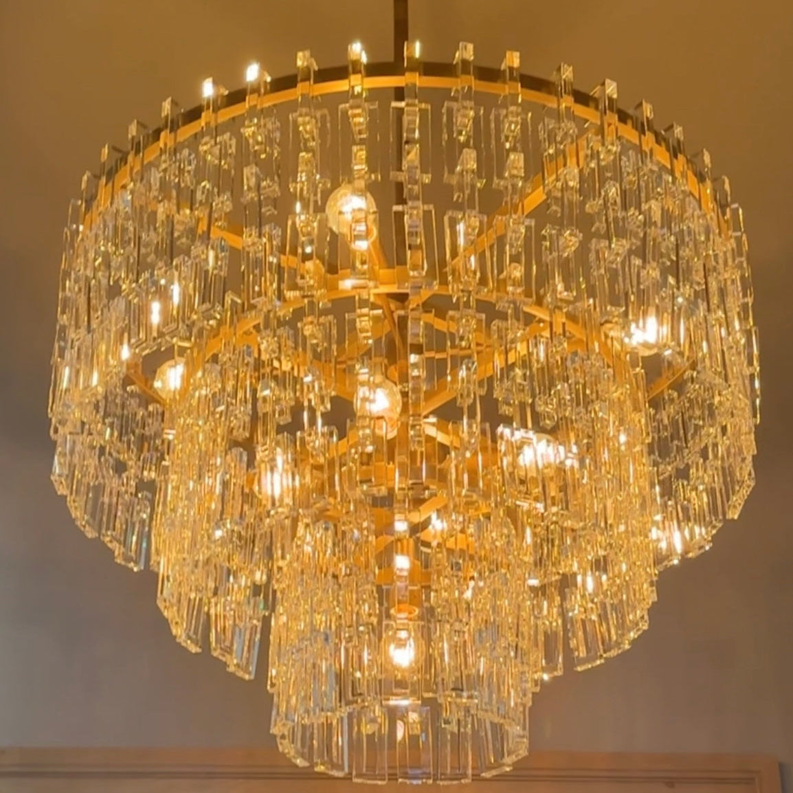 This chandelier showcases a dramatic tiered silhouette formed by over 350 precisely arranged K9 crystal pieces. Each interlocking glass element captures and refracts light, creating a radiant cascade that sparkles from every angle. Suspended with minimal hardware for a floating effect, the round form adds sculptural elegance to dining rooms, foyers, or grand living spaces.