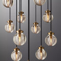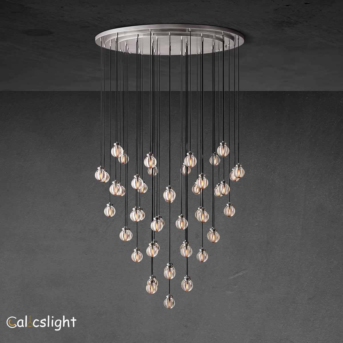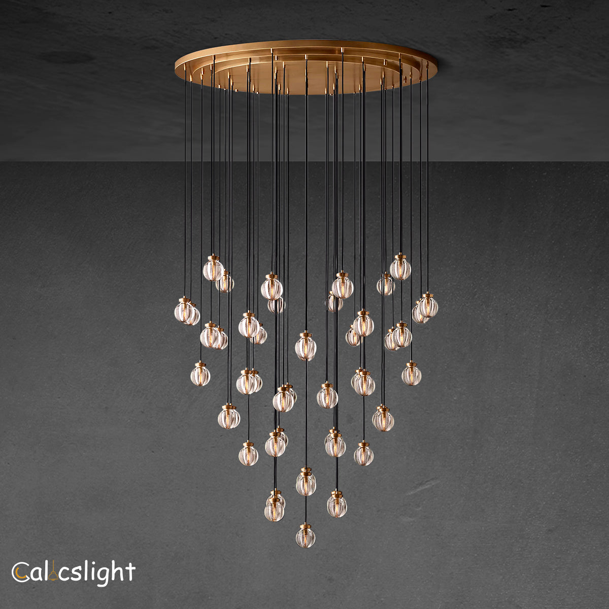 Made of glass and brass, this chandelier is inspired by pearls, with intricate grooves carved into the glass pearls, creating shimmering layers of light that bring luster and make these pieces feel ethereal and intimate at the same time.