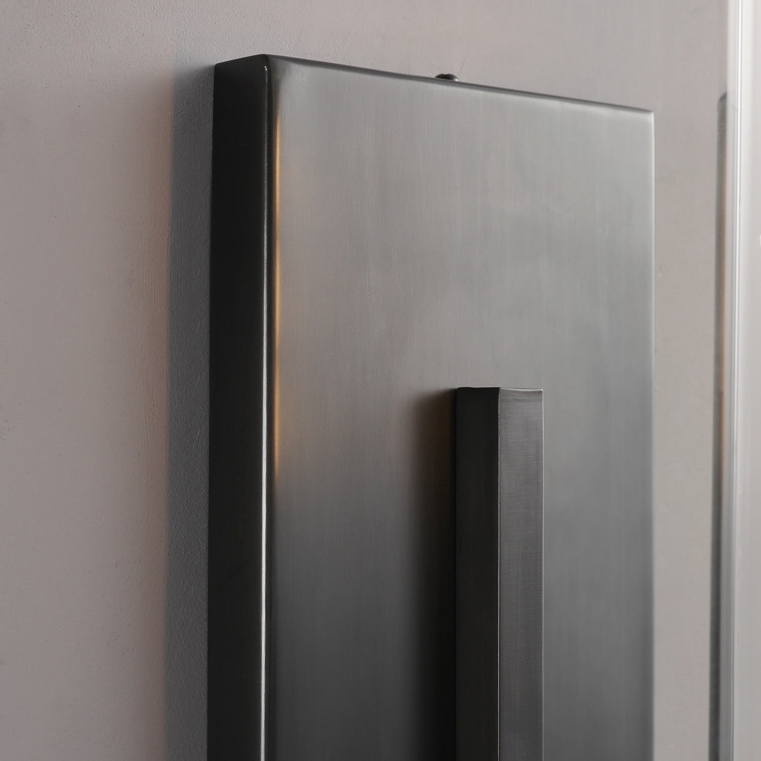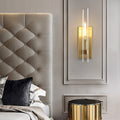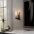 Ravelle Glass Grand Wall Sconce Crafted from solid steel, the unadorned metal band holds the slender glass columns in place for a perfectly balanced look. The Edison bulb in each cylinder emits a warm candlelight.